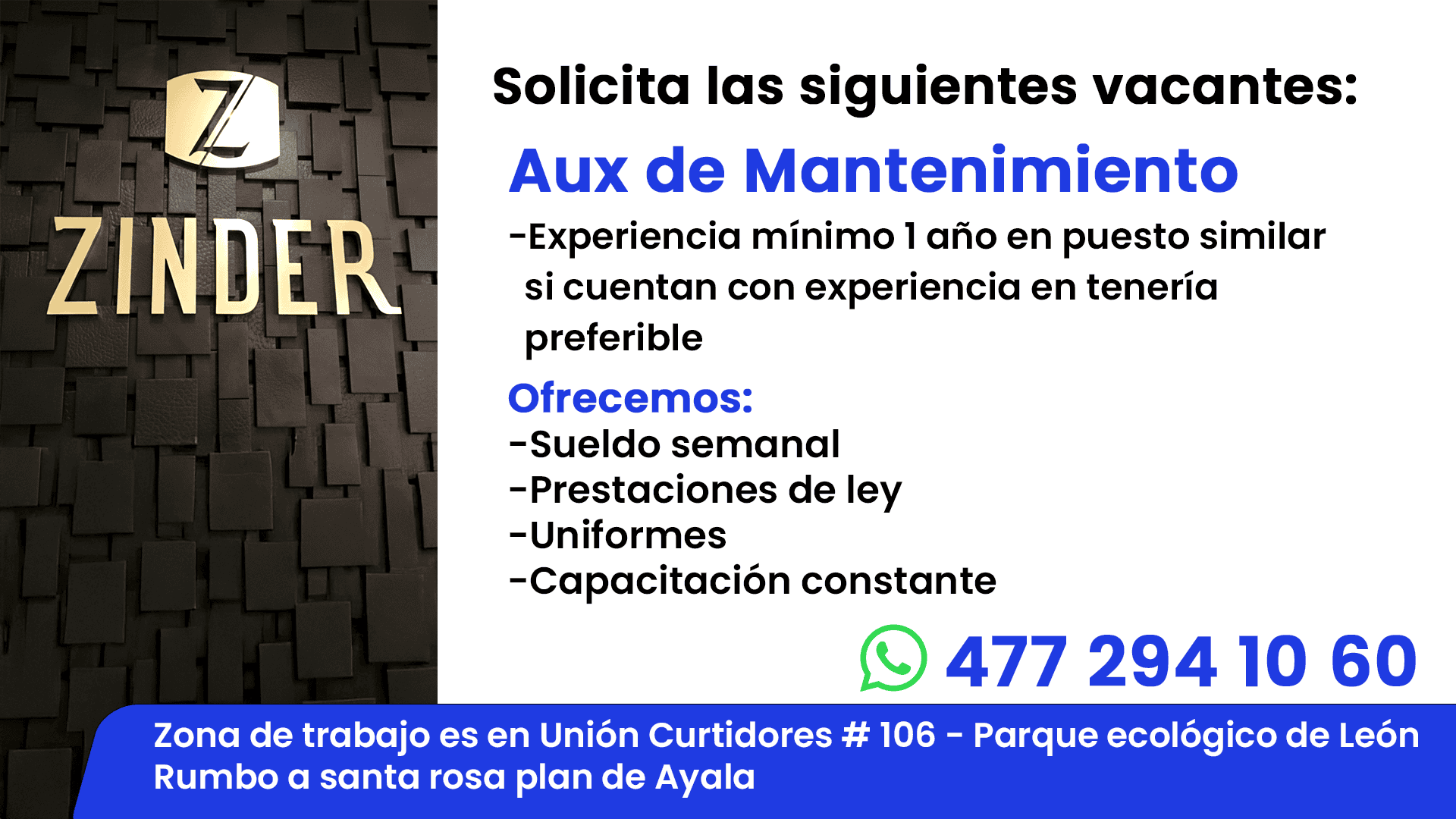 Experiencia mínimo 1 año en puesto similar si cuentan con experiencia en tenería preferible