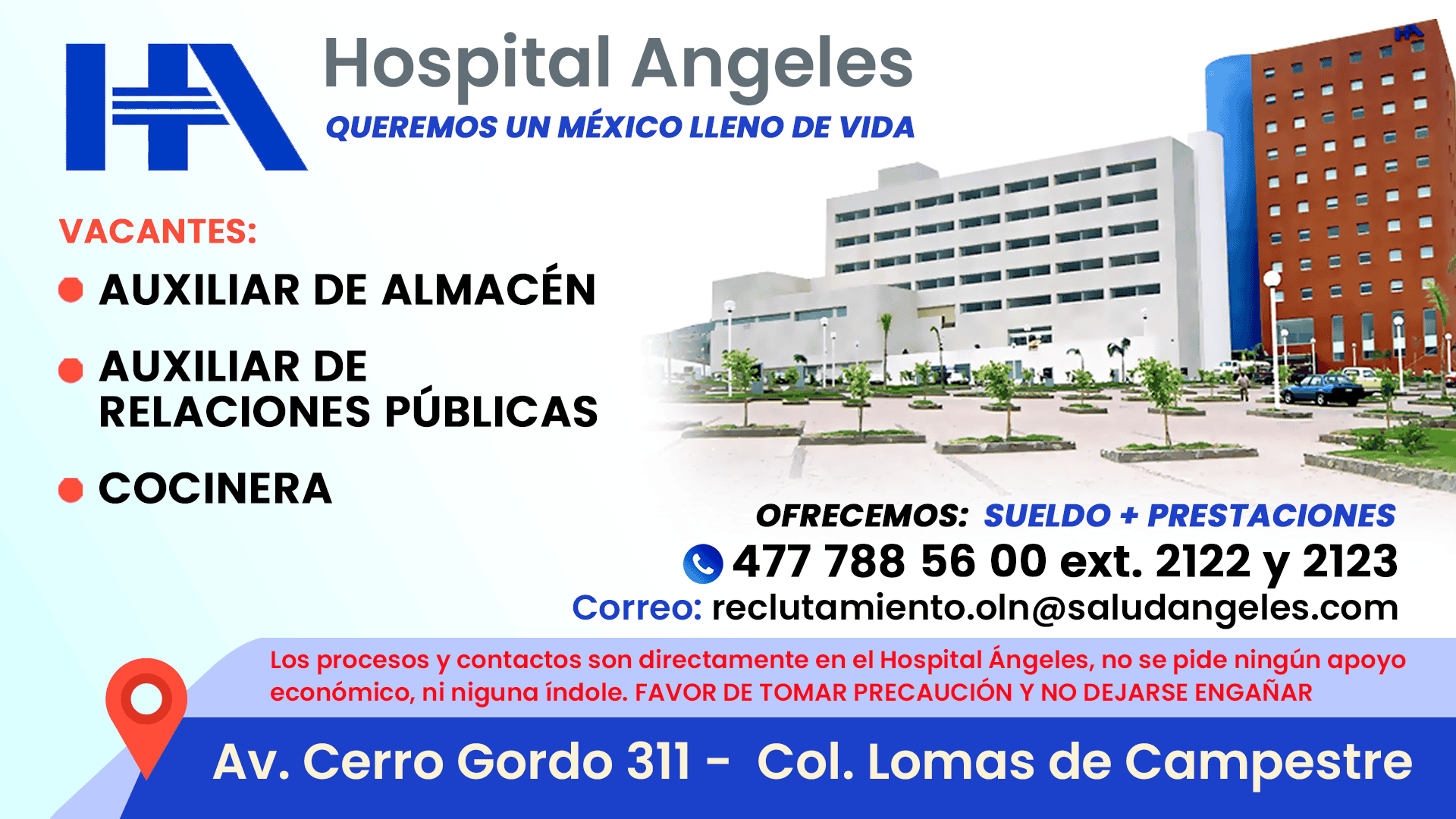 EMPLEOSDescripción Puesto o área... Seleccionar categoríaCall Center y TelemercadeoCobranzaIngenieríaInformática, Tecnologías de la información y TelecomunicacionesHotelería y Turismo LimpiezaConstrucción y ObraContabilidad y FinanzasMercadotecnia y PublicidadAdministración y OficinaDocenciaMantenimiento y ReparacionesLegal Abogado fiscalProducción y ManufacturaCompras y Comercio ExteriorVentasDiseño y Artes GráficasAlmacén, Logística y TransporteCalidadAtención a clientesDirección y GerenciaMedicina y Servicios de SaludOtrosServicios Generales y AseoCocinaSeguridadDerechoRecursos HumanosOperativo Buscar Buscar Buscar Más filtros Jornada Pay Periods Deadline Open Position Volver al listado Cocinera ¡Estamos contratando! León Cocina Volver atrás Compartir Facebook Twitter LinkedIn Whatsapp Descripción Hospital Ángeles solicita Datos de contacto Dirección Av. Cerro Gordo 311 Colonia Col. Lomas de Campestre Teléfono 477 788 56 00 ext. 2122 y 2123 Email reclutamiento.oln@saludangeles.com