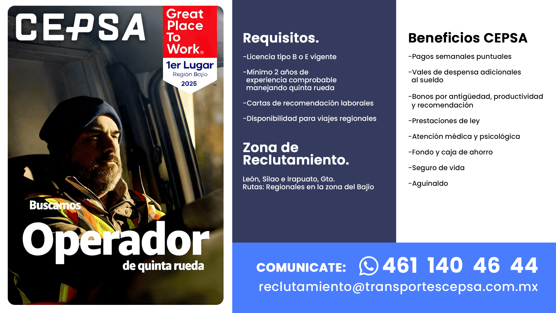 Mínimo 2 años de experiencia comprobable manejando quinta rueda